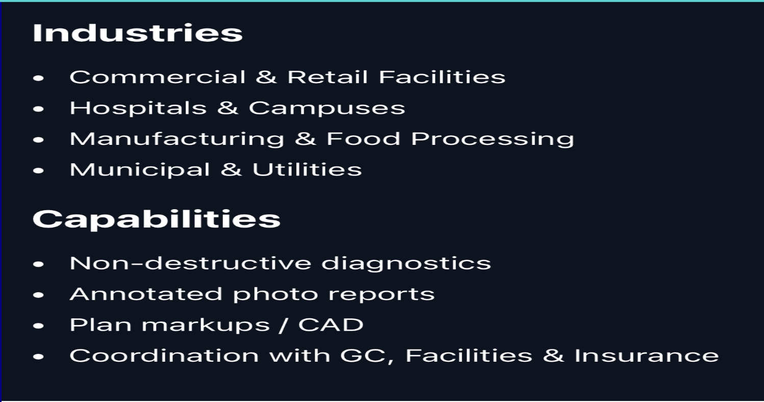 tility Locators San Bernardino,Riverside,Los Angeles,Orange,San Diego,Ventura CountShear Wall Inspections. Utility Locators San Bernardino,Riverside,Los Angeles,Orange,San Diego,Ventura  Concrete IDeputy Inspection Service. Call Now! Friendly & Personable · Last Minute Scheduling · 24 Hour Text & Call · Competitive Pricing Seox.  Private ConcreteThermal Imaging Surveys Services  When Needed: For private lines and systems not covered by the service, including: Irrigation systems  Parking lot lighting  SecurUtility and fire control systems  Storage tanks  Process sewers  How it Works: Private locators use advanced technologies: Electromagnetic Locators: These use transmitters and receivers to detect signals on conductive lines.  Ground Penetrating Radar (GPR): A non-invasive tool that uses radar waves to map underground ities and structures.  Prevent costly damage, project delays, and safety risks associated with hitting private lines.  Utility Marking Colors  Once located, underground ities are marked using universal spray paint colors to identify their type. Red: Electrical, conduit, lighting Orange: Telecommunications, TV, alarm, signal Yellow: Gas, oil, steam, petroleum Green: Sewer, storm drain Blue: Potable water Purple: Reclaimed water, irrigation Pink: Temporary marking White: Proposed excavation Utility location - Wikipedia Utility color codes are used to identify existing underground ities in construction areas, to protect them from damage during ... Wikipedia How Utility Locators Work as their cathotic protection for corrosion. not used as often. but these are some of the passive modes that we have an... Private ConcreteThermal Imaging Surveys Services  Services - Comprehensive Damage Prevention. The law requires that you prior to digging to have underground ities marked. However... 79936 EL PASO 60629 CHICAGO 11368 CORONA 90650 NORWALK 11220 BROOKLYN 90201 BELL GARDENS 90011 LOS ANGELES 91331 PACOIMA 11385 RIDGEWOOD 77084 HOUSTON 11373 ELMHURST 10467 BRONX 92335 FONTANA 11226 BROOKLYN 60618 CHICAGO 10025 NEW YORK 11236 BROOKLYN 11219 BROOKLYN 77449 KATY 90280 SOUTH GATE 11234 BROOKLYN 90250 HAWTHORNE 11211 BROOKLYN 11208 BROOKLYN 90805 LONG BEACH 08701 LAKEWOOD 11207 BROOKLYN 60639 CHICAGO 92503 RIVERSIDE 60632 CHICAGO 92683 WESTMINSTER 92336 FONTANA 78521 BROWNSVILLE 75052 GRAND PRAIRIE 91342 SYLMAR 10456 BRONX 90044 LOS ANGELES 10314 STATEN ISLAND 92704 SANTA ANA 60647 CHICAGO 11377 WOODSIDE 94565 PITTSBURG 60623 CHICAGO 92376 RIALTO 91744 LA PUENTE 92804 ANAHEIM 11212 BROOKLYN 11230 BROOKLYN 92154 SAN DIEGO 60804 CICERO 30043 LAWRENCEVILLE 60617 CHICAGO 11355 FLUSHING 11214 BROOKLYN 95076 WATSONVILLE 94112 SAN FRANCISCO 75217 DALLAS 93307 BAKERSFIELD 10002 NEW YORK 37013 ANTIOCH 91911 CHULA VISTA 30044 LAWRENCEVILLE 93033 OXNARD 91710 CHINO 11206 BROOKLYN 11221 BROOKLYN 11229 BROOKLYN 11204 BROOKLYN 92345 HESPERIA 10453 BRONX 93722 FRESNO 11203 BROOKLYN 60625 CHICAGO 75070 MCKINNEY 60608 CHICAGO 79912 EL PASO 77479 SUGAR LAND 92509 RIVERSIDE 92126 SAN DIEGO 10029 NEW YORK 37211 NASHVILLE 10462 BRONX 91910 CHULA VISTA 91706 BALDWIN PARK 90706 BELLFLOWER 90255 HUNTINGTON PARK 91335 RESEDA 94544 HAYWARD 93257 PORTERVILLE 19120 PHILADELPHIA 66062 OLATHE 87121 ALBUQUERQUE 91709 CHINO HILLS 75034 FRISCO 78660 PFLUGERVILLE 92553 MORENO VALLEY 10452 BRONX 10458 BRONX 77584 PEARLAND 11218 BROOKLYN 96797 WAIPAHU 22193 WOODBRIDGE 28269 CHARLOTTE 11235 BROOKLYN 11223 BROOKLYN 93550 PALMDALE 77429 CYPRESS 95823 SACRAMENTO 78572 MISSION 33012 HIALEAH 77573 LEAGUE CITY 93535 LANCASTER 75211 DALLAS 60620 CHICAGO 85364 YUMA 23464 VIRGINIA BEACH 92592 TEMECULA 60634 CHICAGO 11209 BROOKLYN 77379 SPRING 95630 FOLSOM 94110 SAN FRANCISCO 78577 PHARR 63376 SAINT PETERS 93065 SIMI VALLEY 10469 BRONX 85225 CHANDLER 10468 BRONX 77083 HOUSTON 60628 CHICAGO 77494 KATY 92805 ANAHEIM 91766 POMONA 91402 PANORAMA CITY 99301 PASCO 60505 AURORA 33186 MIAMI 80013 AURORA 89110 LAS VEGAS 60085 WAUKEGAN 93274 TULARE 93727 FRESNO 60641 CHICAGO 75228 DALLAS 94587 UNION CITY 10466 BRONX 77450 KATY 10463 BRONX 10457 BRONX 07055 PASSAIC 90022 LOS ANGELES 90262 LYNWOOD 85032 PHOENIX 93536 LANCASTER 92703 SANTA ANA 94536 FREMONT 21234 PARKVILLE 11375 FOREST HILLS 33024 HOLLYWOOD 97007 BEAVERTON 94533 FAIRFIELD 89108 LAS VEGAS 30349 ATLANTA 10472 BRONX 11215 BROOKLYN 92882 CORONA 27610 RALEIGH 90026 LOS ANGELES 30024 SUWANEE 19111 PHILADELPHIA 11233 BROOKLYN 45011 HAMILTON 92105 SAN DIEGO 77095 HOUSTON 78613 CEDAR PARK 37042 CLARKSVILLE 77036 HOUSTON 60614 CHICAGO 47906 WEST LAFAYETTE 95035 MILPITAS 92114 SAN DIEGO 60657 CHICAGO 90631 LA HABRA 07087 UNION CITY 33157 MIAMI 11746 HUNTINGTON STATION 20906 SILVER SPRING 93306 BAKERSFIELD 30096 DULUTH 84118 SALT LAKE CITY 94558 NAPA 06902 STAMFORD 19143 PHILADELPHIA 91730 RANCHO CUCAMONGA 92880 CORONA 29483 SUMMERVILLE 90003 LOS ANGELES 95687 VACAVILLE 78596 WESLACO 30022 ALPHARETTA 95206 STOCKTON 78666 SAN MARCOS 30281 STOCKBRIDGE 93230 HANFORD 75002 ALLEN 11706 BAY SHORE 78542 EDINBURG 97006 BEAVERTON 90019 LOS ANGELES 33311 FORT LAUDERDALE 11210 BROOKLYN 96706 EWA BEACH 95127 SAN JOSE 94080 SOUTH SAN FRANCISCO 92021 EL CAJON 33015 HIALEAH 60619 CHICAGO 87114 ALBUQUERQUE 14850 ITHACA 33023 HOLLYWOOD 85308 GLENDALE 80219 DENVER 80015 AURORA 60640 CHICAGO 76244 KELLER 19124 PHILADELPHIA 60402 BERWYN 33411 WEST PALM BEACH 44035 ELYRIA 08753 TOMS RIVER 07002 BAYONNE 30062 MARIETTA 92677 LAGUNA NIGUEL 95123 SAN JOSE 20878 GAITHERSBURG 21215 BALTIMORE 11372 JACKSON HEIGHTS 90660 PICO RIVERA 78046 LAREDO 07305 JERSEY CITY 90640 MONTEBELLO 92801 ANAHEIM 10009 NEW YORK 11434 JAMAICA 60609 CHICAGO 90004 LOS ANGELES 23454 VIRGINIA BEACH 48197 YPSILANTI 94509 ANTIOCH 76028 BURLESON 10027 NEW YORK 48180 TAYLOR 20011 WASHINGTON 92201 INDIO 91732 EL MONTE 91770 ROSEMEAD 89031 NORTH LAS VEGAS 84015 CLEARFIELD 95624 ELK GROVE 91343 NORTH HILLS 76063 MANSFIELD 44256 MEDINA 93906 SALINAS 92562 MURRIETA 11213 BROOKLYN 07093 WEST NEW YORK 92404 SAN BERNARDINO 89121 LA